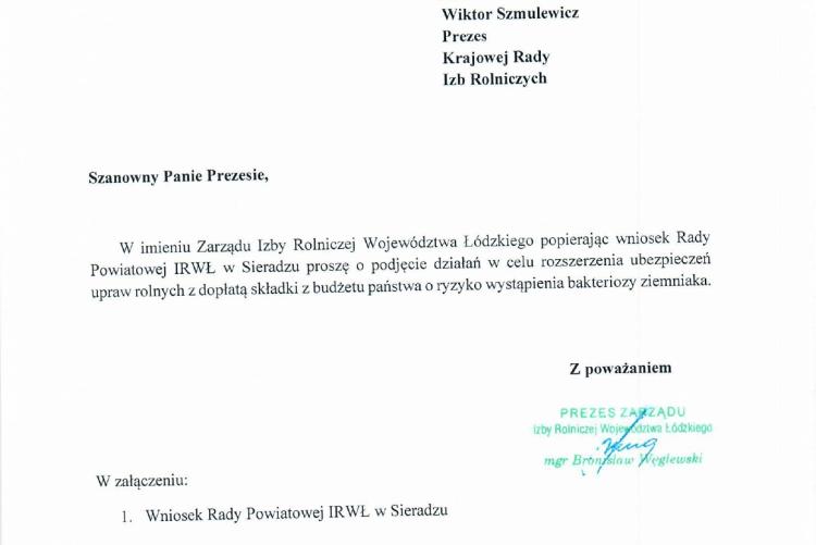 W imieniu Zarządu Izby Rolniczej Województwa Łódzkiego popierając wniosek Rady Powiatowej IRWŁ Powiatu Sieradzkiego, Prezes IRWŁ Bronisław Węglewski skierował pismo do Prezesa KRIR Wiktora Szmukewicza z prośbą o podjęcie działań w celu rozszerzenia ubezpieczeń upraw rolnych z dopłatą składki z budżetu państwa o ryzyko wystąpienia bakteriozy ziemniaka.