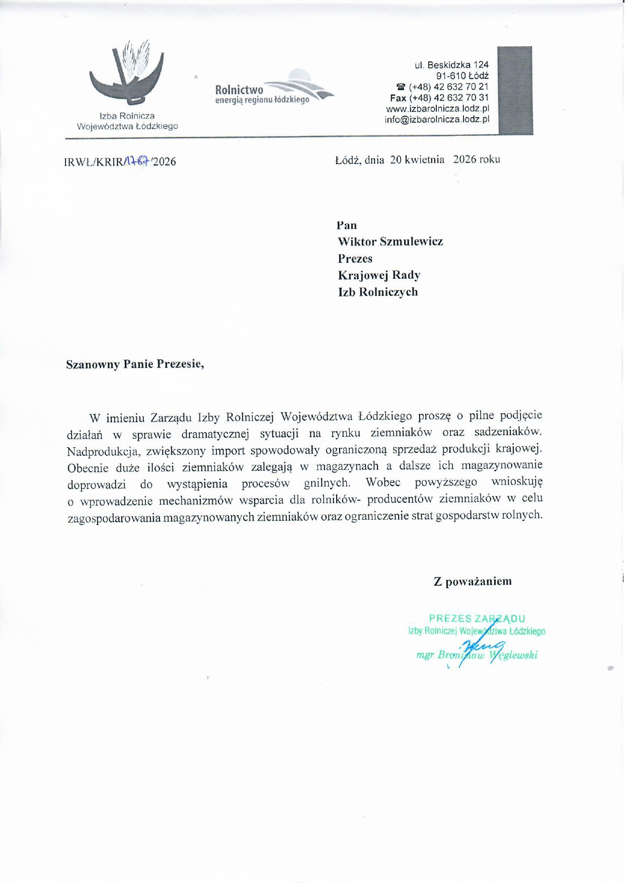W imieniu Zarządu Izby Rolniczej Województwa Łódzkiego, Prezes IRWŁ Bronisław Węglewski skierował pismo do Prezesa KRIR Wiktora Szmulewicza z prośbą o pilne podjęcie działań w sprawie dramatycznej sytuacji na rynku ziemniaków oraz sadzeniaków. Nadprodukcja, zwiększony import spowodowały ograniczoną sprzedaż produkcji krajowej. Obecnie duże ilości ziemniaków zalegają w magazynach a dalsze ich magazynowanie doprowadzi do wystąpienia procesów gnilnych. Wobec powyższego IRWŁ wnioskuje o wprowadzenie mechanizmów wsparcia dla rolników- producentów ziemniaków w celu zagospodarowania magazynowanych ziemniaków oraz ograniczenie strat gospodarstw rolnych.