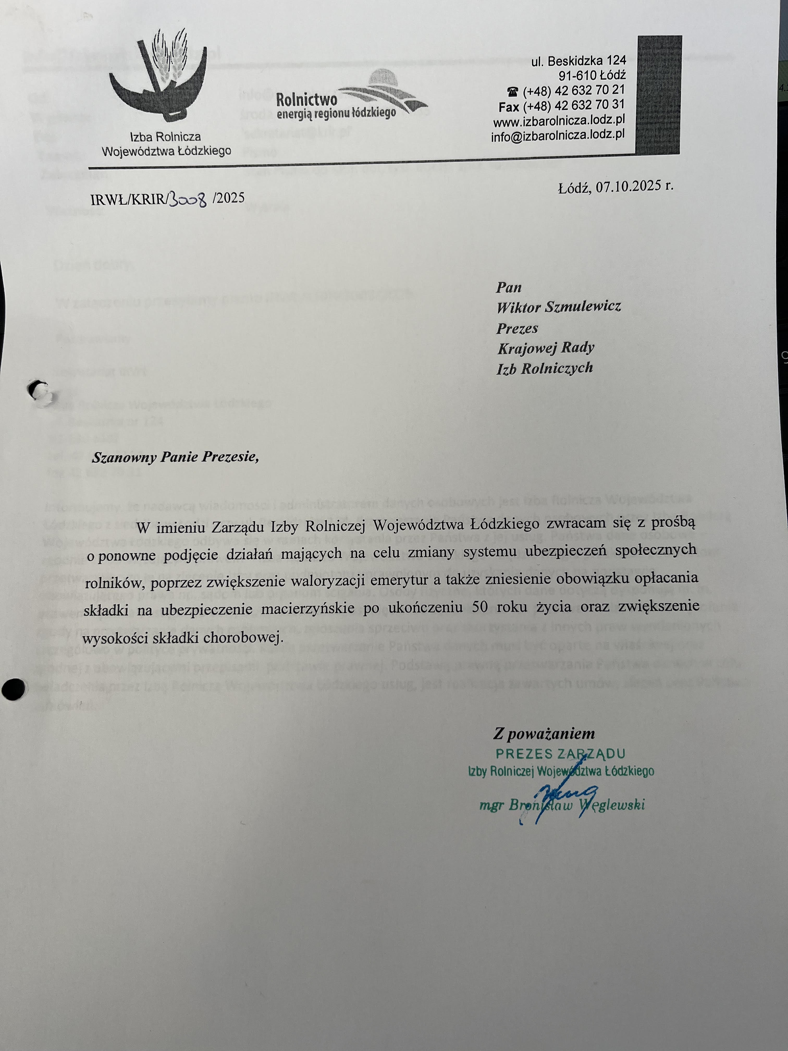 7 października 2025 roku w imieniu Zarządu Izby Rolniczej Województwa Łódzkiego, Prezes Bronisław Węglewski zwrócił się z prośbą do Wiktora Szmulewicza Prezesa Krajowej Rady Izb Rolniczych z prośbą o ponowne podjęcie działań mających na celu zmiany systemu ubezpieczeń społecznych rolników, poprzez zwiększenie waloryzacji emerytur a także zniesienie obowiązku opłacania składki na ubezpieczenie macierzyństwie po ukończeniu 50 roku życia oraz zwiększenie wysokości składki chorobowej.