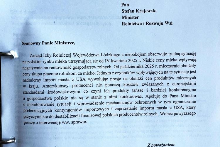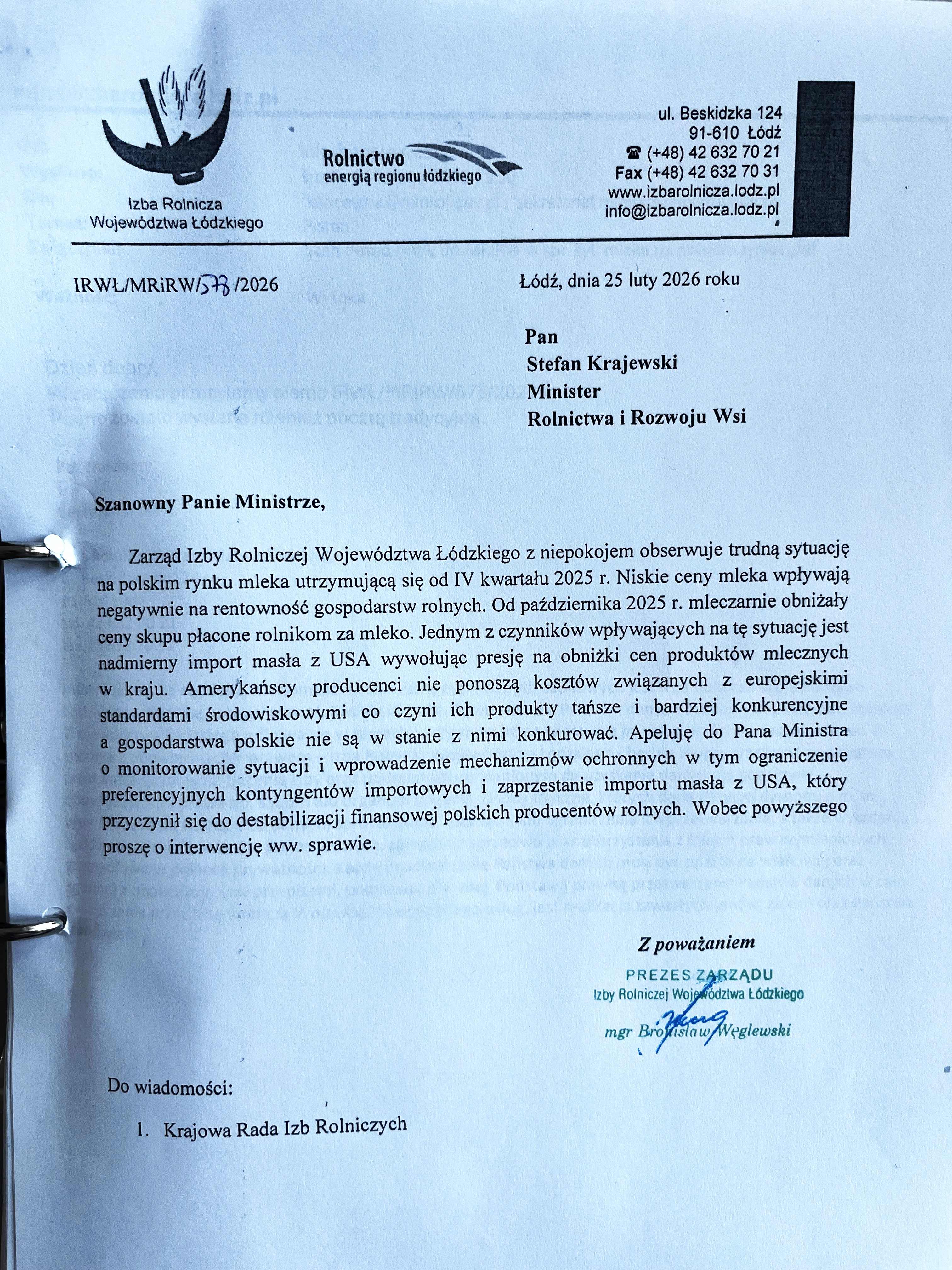 Zarząd Izby Rolniczej Województwa Łódzkiego z niepokojem obserwuje trudną sytuację na polskim rynku mleka utrzymującą się od IV kwartału 2025 r. Niskie ceny mleka wpływają negatywnie na rentowność gospodarstw rolnych. Od października 2025 r. mleczarnie obniżały ceny skupu płacone rolnikom za mleko. Jednym z czynników wpływających na tę sytuację jest nadmierny import masła z USA wywołując presję na obniżki cen produktów mlecznych w kraju. Amerykańscy producenci nie ponoszą kosztów związanych z europejskimi standardami środowiskowymi co czyni ich produkty tańsze i bardziej konkurencyjne a gospodarstwa polskie nie są w stanie z nimi konkurować. Prezes IRWŁ Bronisław Węglewski zaapalował do Ministra Rolnictwa i Rozwoju Wsi Stefana Krajewskiego o monitorowanie sytuacji i wprowadzenie mechanizmów ochronnych w tym ograniczenie preferencyjnych kontyngentów importowych i zaprzestanie importu masła z USA, który przyczynił się do destabilizacji finansowej polskich producentów rolnych. Prosimy o interewncję w tej sprawie.