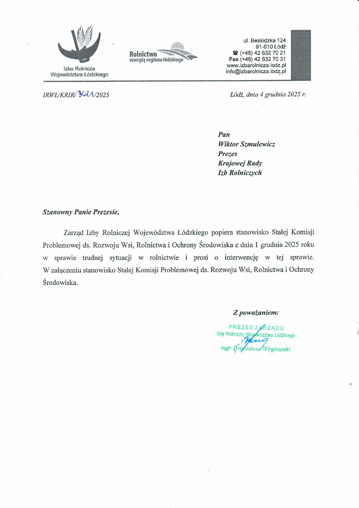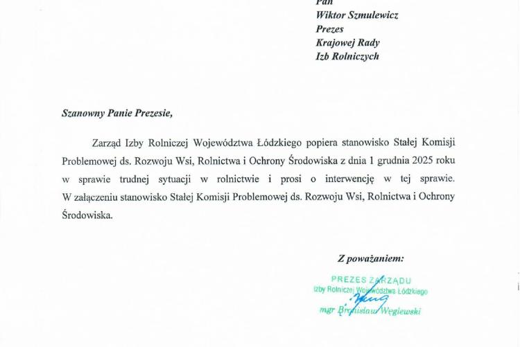 W imieniu Zarządu Izby Rolniczej Województwa Łódzkiego, Prezes IRWŁ Bronisław Węglewski skierował pismo do Prezesa Krajowej Rady Izb Rolniczych Wiktora Szmulewicza z poparciem stanowiska Stałej Komisji Problemowej ds. Rozwoju Wsi, Rolnictwa i Ochrony Środowiska z dnia 1 grudnia 2025 roku w sprawie trudnej sytuacji w rolnictwie z prosbą o interwencję w tej sprawie. W załączeniu stanowisko Stałej Komisji Problemowej ds. Rozwoju Wsi, Rolnictwa i Ochrony Środowiska.