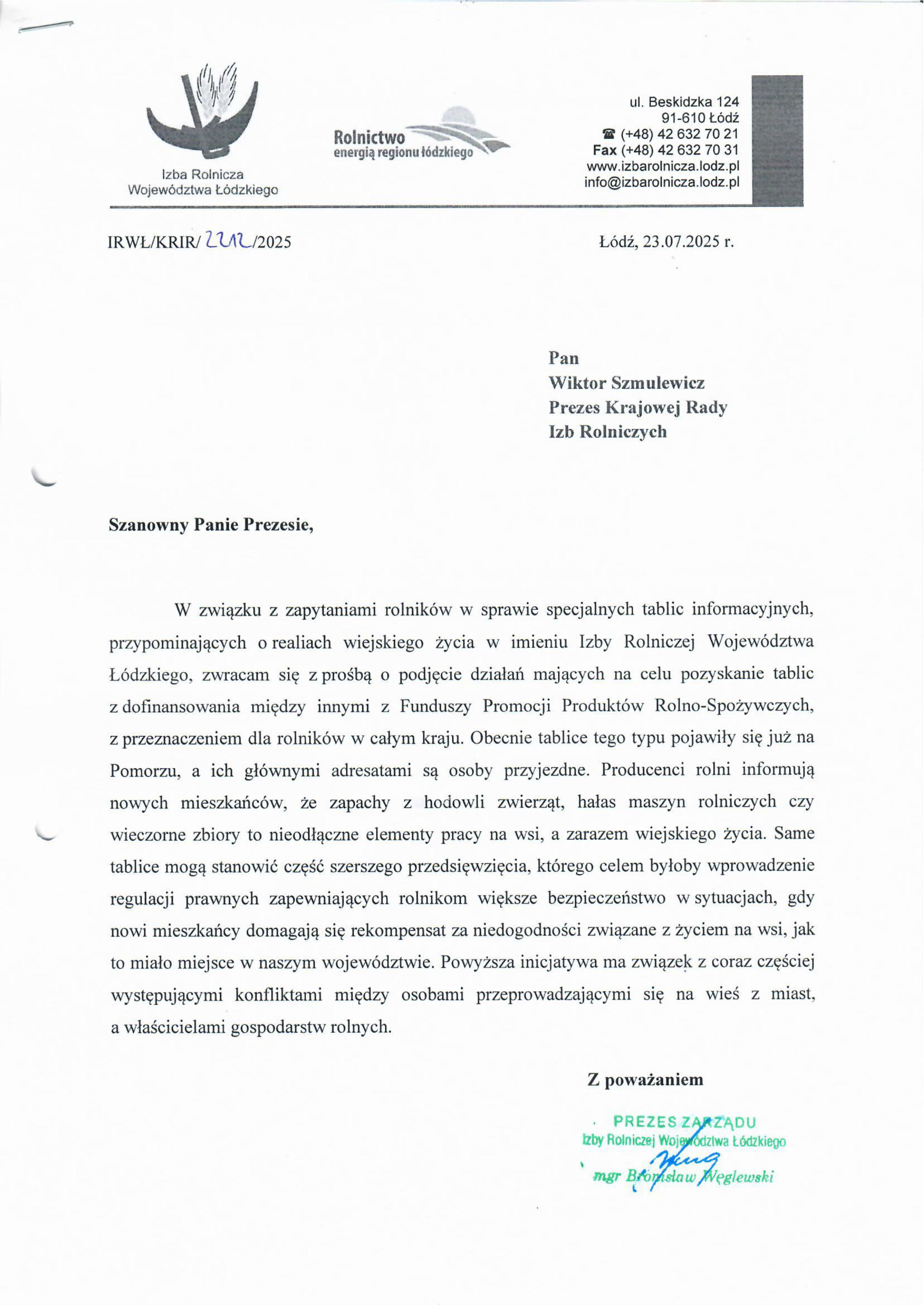W imieniu Zarządu IRWŁ oraz w związku z zapytaniami rolników w sprawie specjalnych tablic informacyjnych, przypominających o realiach wiejskiego życia, Prezes IRWŁ Bronisław Węglewski zwrócił się z prośbą do Prezesa KRIR Wiktora Szmulewicza o podjęcie działań mających na celu pozyskanie tablic z dofinansowania między innymi z Funduszy Promocji Produktów Rolno-Spożywczych, z przeznaczeniem dla rolników w całym kraju. Obecnie tablice tego typu pojawiły się już na Pomorzu, a ich głównymi adresatami są osoby przyjezdne. Producenci rolni informują nowych mieszkańców, że zapachy z hodowli zwierząt, hałas maszyn rolniczych czy wieczorne zbiory to nieodłączne elementy pracy na wsi, a zarazem wiejskiego życia. Same tablice mogą stanowić część szerszego przedsięwzięcia, którego celem byłoby wprowadzenie regulacji prawnych zapewniających rolnikom większe bezpieczeństwo w sytuacjach, gdy nowi mieszkańcy domagają się rekompensat za niedogodności związane z życiem na wsi, jak to miało miejsce w naszym województwie. Powyższa inicjatywa ma związek z coraz częściej występującymi konfliktami między osobami przeprowadzającymi się na wieś z miast, a właścicielami gospodarstw rolnych.