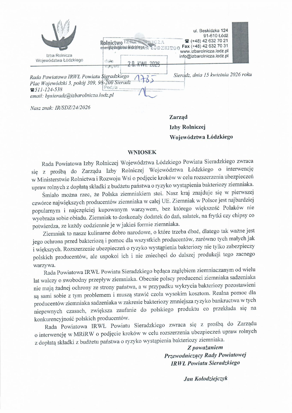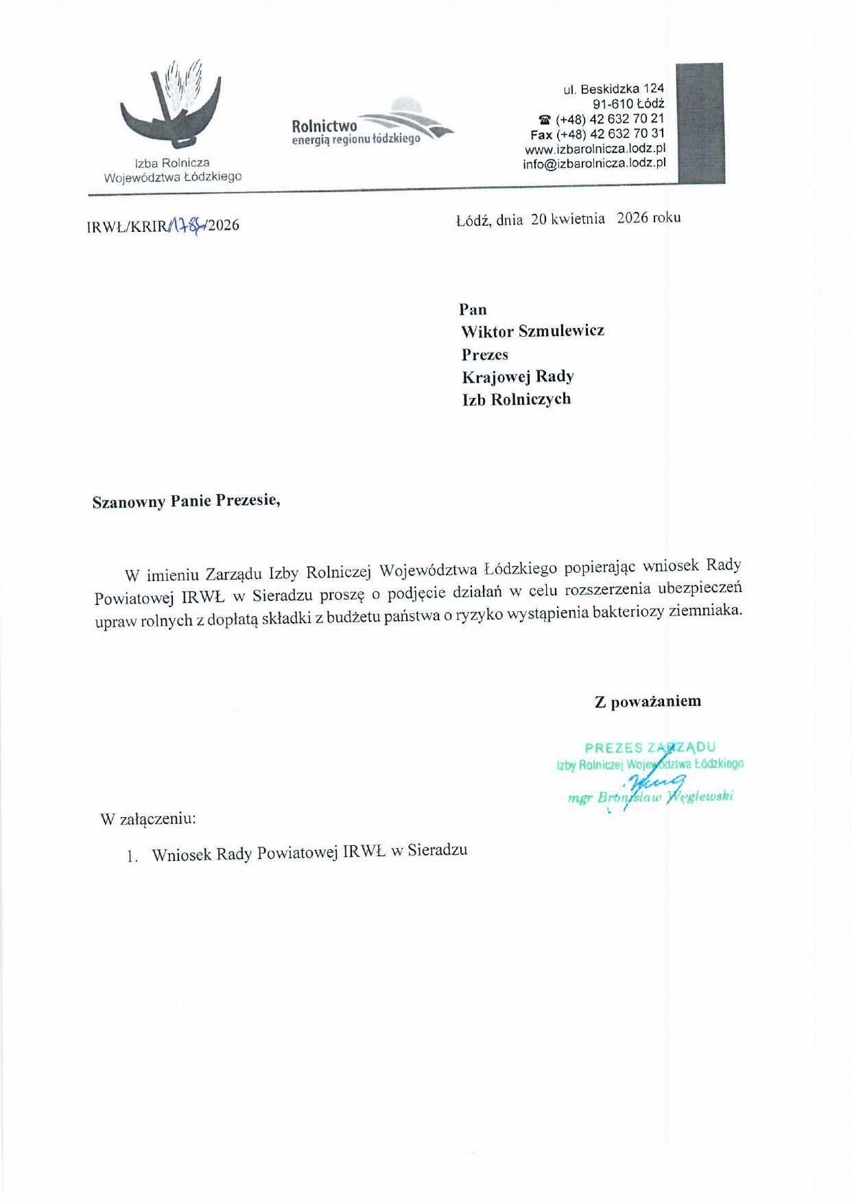 W imieniu Zarządu Izby Rolniczej Województwa Łódzkiego popierając wniosek Rady Powiatowej IRWŁ Powiatu Sieradzkiego, Prezes IRWŁ Bronisław Węglewski skierował pismo do Prezesa KRIR Wiktora Szmukewicza z prośbą o podjęcie działań w celu rozszerzenia ubezpieczeń upraw rolnych z dopłatą składki z budżetu państwa o ryzyko wystąpienia bakteriozy ziemniaka.