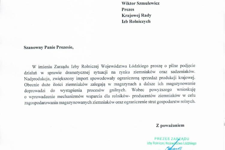 W imieniu Zarządu Izby Rolniczej Województwa Łódzkiego, Prezes IRWŁ Bronisław Węglewski skierował pismo do Prezesa KRIR Wiktora Szmulewicza z prośbą o pilne podjęcie działań w sprawie dramatycznej sytuacji na rynku ziemniaków oraz sadzeniaków. Nadprodukcja, zwiększony import spowodowały ograniczoną sprzedaż produkcji krajowej. Obecnie duże ilości ziemniaków zalegają w magazynach a dalsze ich magazynowanie doprowadzi do wystąpienia procesów gnilnych. Wobec powyższego IRWŁ wnioskuje o wprowadzenie mechanizmów wsparcia dla rolników- producentów ziemniaków w celu zagospodarowania magazynowanych ziemniaków oraz ograniczenie strat gospodarstw rolnych.