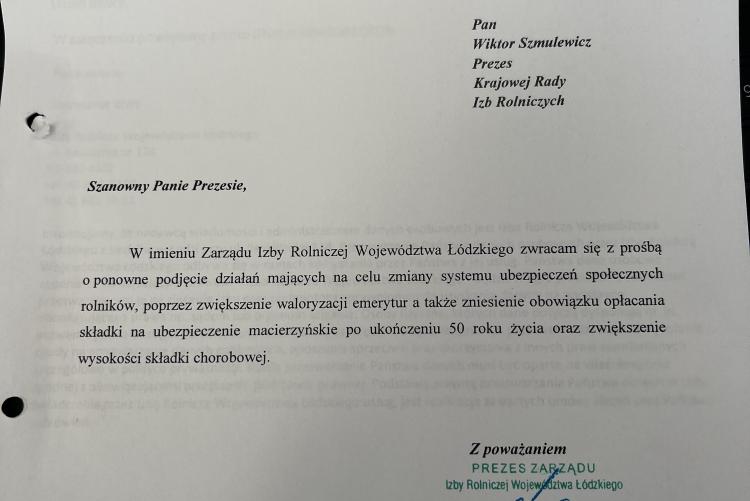 7 października 2025 roku w imieniu Zarządu Izby Rolniczej Województwa Łódzkiego, Prezes Bronisław Węglewski zwrócił się z prośbą do Wiktora Szmulewicza Prezesa Krajowej Rady Izb Rolniczych z prośbą o ponowne podjęcie działań mających na celu zmiany systemu ubezpieczeń społecznych rolników, poprzez zwiększenie waloryzacji emerytur a także zniesienie obowiązku opłacania składki na ubezpieczenie macierzyństwie po ukończeniu 50 roku życia oraz zwiększenie wysokości składki chorobowej.