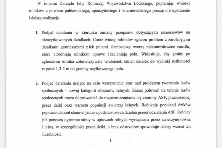 W imieniu Zarządu Izby Rolniczej Województwa Łódzkiego, popierając wnioski rolników z powiatu pabianickiego, opoczyńskiego i skierniewickiego Prezes IRWŁ Bronisław Węglewski skierował pismo do Prezesa KRIR Wiktora Szmulewicza z prośbą o rozpatrzenie i dalszą realizację.