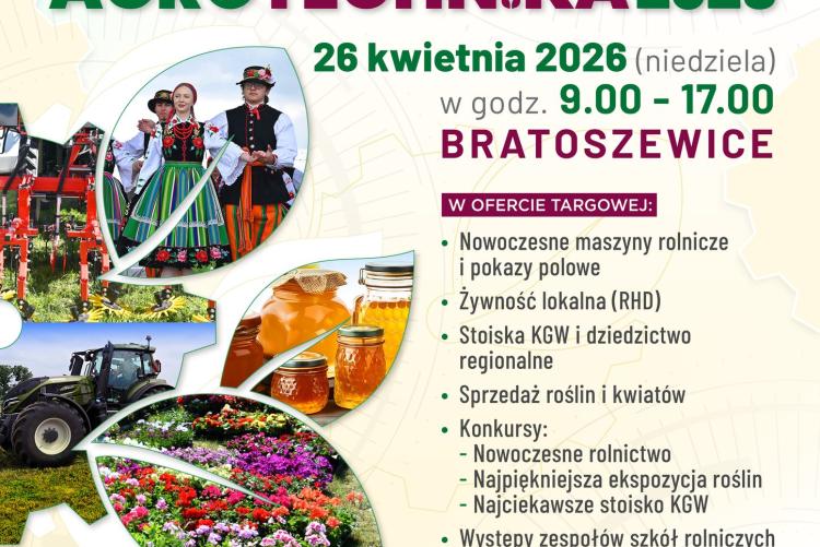 Wiosenna edycja Targów Rolnych AGROTECHNIKA 2026 odbędzie się w dniu 26 kwietnia 2026 r. (niedziela) w godzinach 9:00–17:00 w Bratoszewicach. Miejsce wydarzenia: tereny wystawowe Łódzki Ośrodek Doradztwa Rolniczego z siedzibą w Bratoszewicach, ul. Nowości 32, 95-011 Bratoszewice.